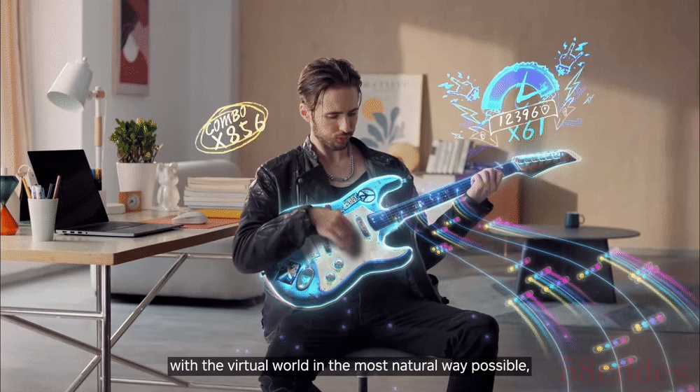 PICO 4系列对于用户交互体验的提升不仅仅限于一款手柄,还体验在新增了眼动追踪、裸手交互、面部追踪等功能上。比如说,PICO 4支持裸手交互,你可以抛开手柄,带着自己的双手直接进入虚拟世界,在虚拟世界里弹你的“空气吉他”。