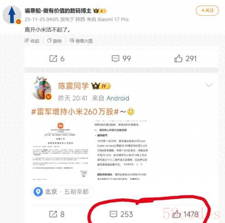 小雷看了一下谝寒船发出来的三张截图。11 月 24 日,陈震发了一条微博,带了雷军增持小米260万股的话题,附了两张图。相比于其他帖子,这条带小米话题的明显数据好了不少。