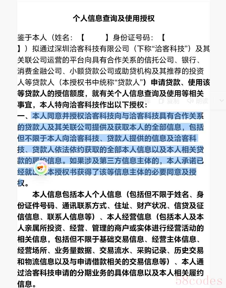 该协议指出:本人同意并授权洽客科技向与治客科技具有合作关系的贷款人及其关联公司提供及获取本人的全部信息,包括但不限于本人向洽客科技、贷款人提供的信息及洽客科技、贷款人依法依约获取的全部本人信息以及本人相关贷款的履约信息。如果涉及第三方信息主体的,本人承诺已经就出具本授权书获得了该等信息主体的必要同意及授权。”