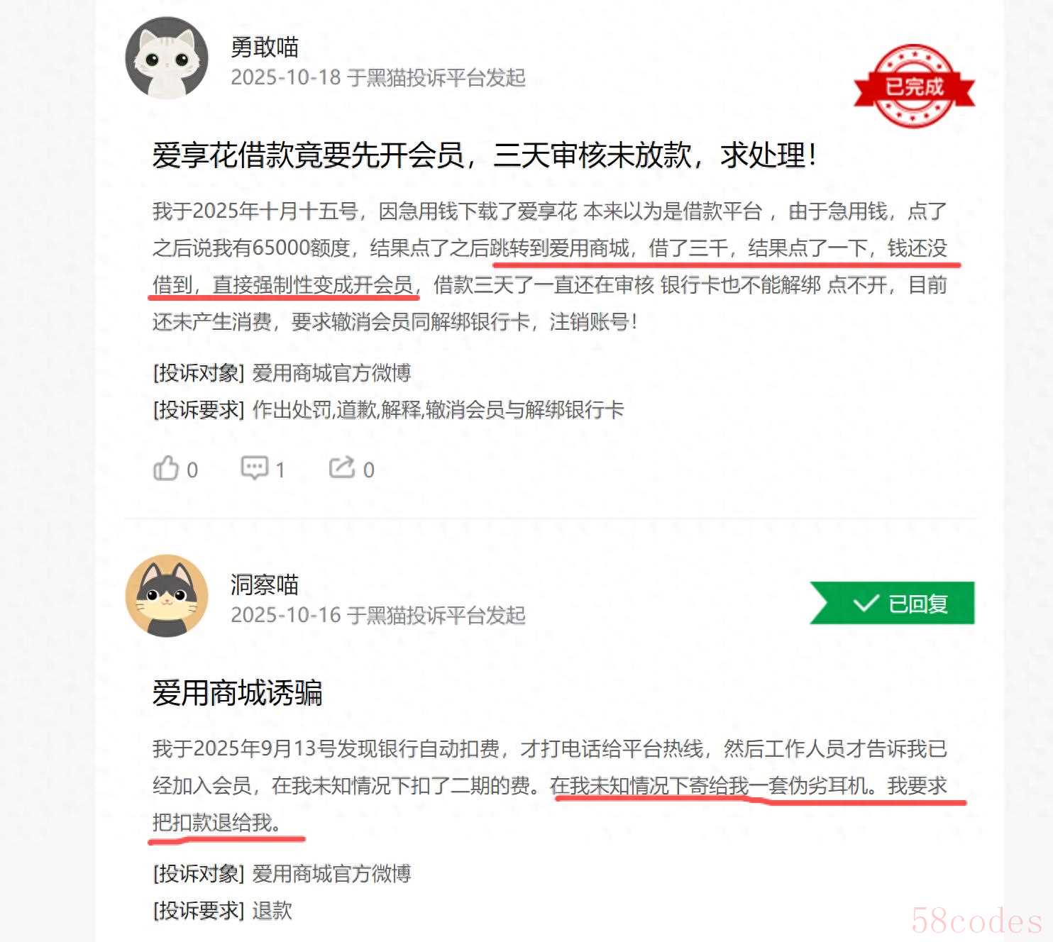 如果在黑猫投诉上检索“爱用商城”,就会见到这样的一幕:大量用户就爱用商城会员费问题进行投诉,很多用户的投诉指向扣费合规性争议。比如10月18日一位用户投诉称:“......跳转到爱用商城,借了三千,结果点了一下,钱还没借到,直接强制性变成开会员......”,该投诉目前为“已完成”状态。截至发稿前,爱用商城在黑猫投诉上的累计投诉量超过21000条。(注:用户投诉内容的真伪,请自行鉴别。)