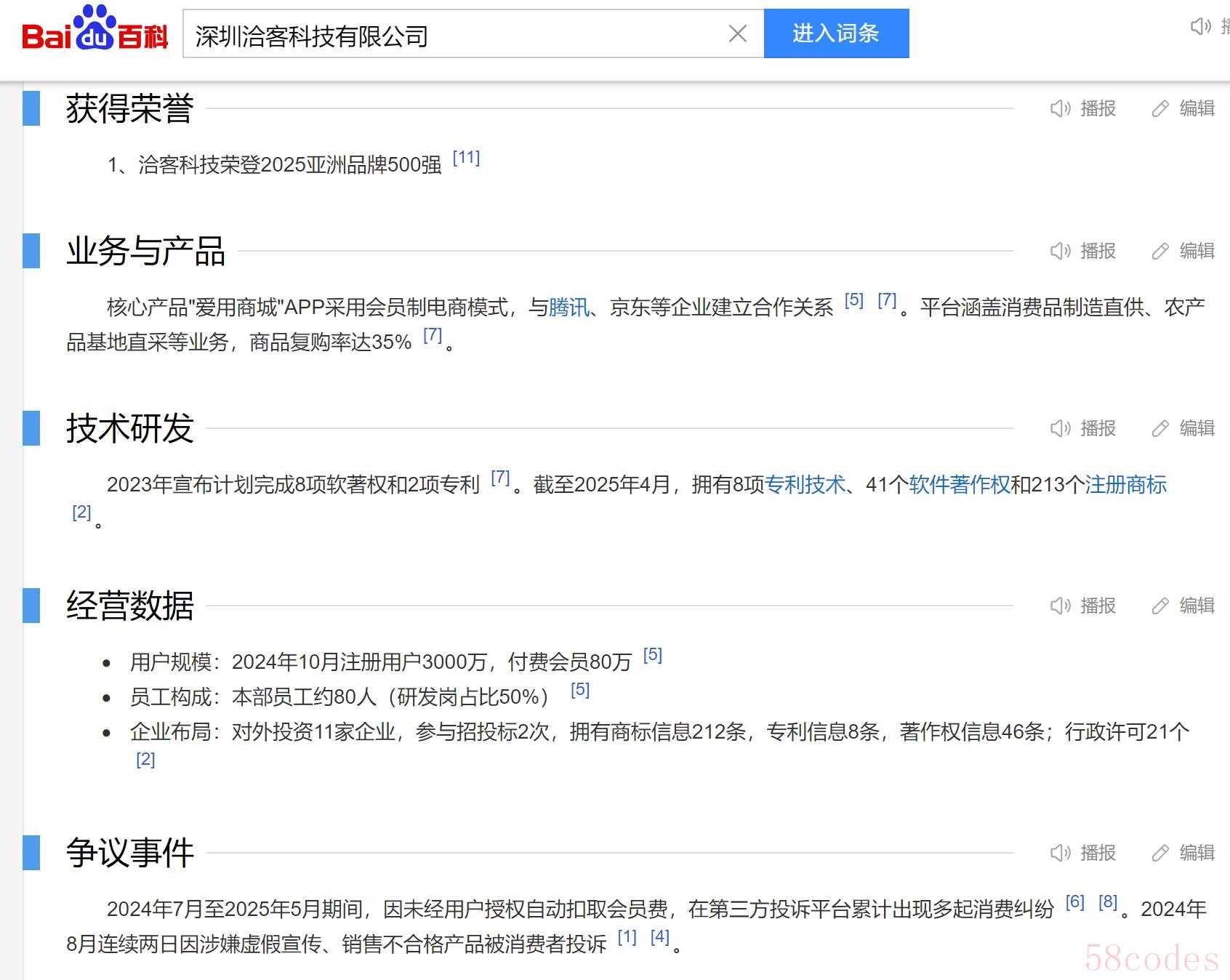 百度百科信息显示:洽客科技于2017年02月14日成立,位列国家高新技术企业;荣登2025亚洲品牌500强等,但百度百科亦通过援引信息指出:“2024年7月至2025年5月期间,因未经用户授权自动扣取会员费,在第三方投诉平台累计出现多起消费纠纷 。2024年8月连续两日因涉嫌虚假宣传、销售不合格产品被消费者投诉。”