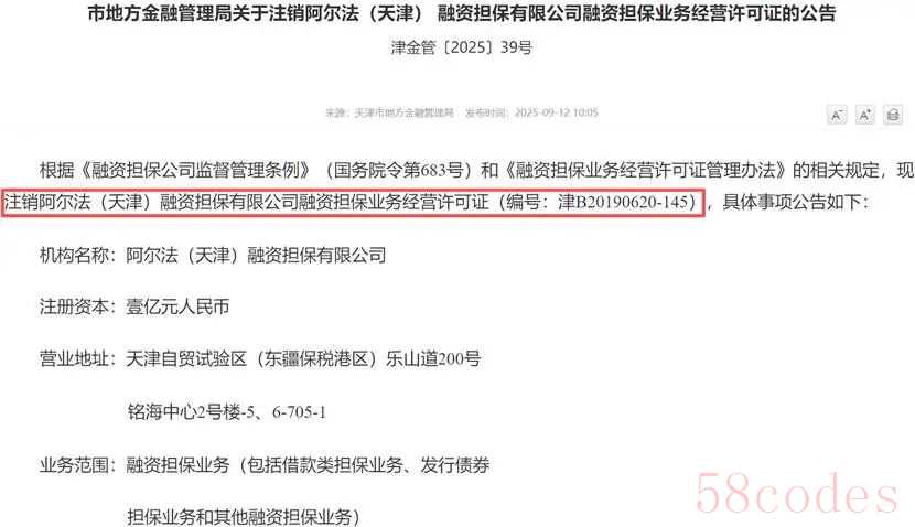 近日,天津市地方金融管理局官网显示,根据相关规定,注销阿尔法(天津)融资担保有限公司(本文称“阿尔法融担”)的融资担保业务经营许可证。