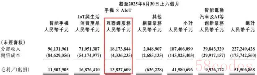2025年上半年,小米集团的互联网服务收入达到181.7亿元,同比增长11.4%,占总营收比例8%左右。同期,该业务板块的毛利为138.4亿元,以此计算,该板块的毛利率达76.2%。