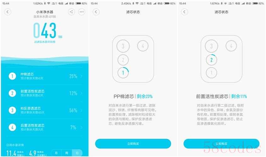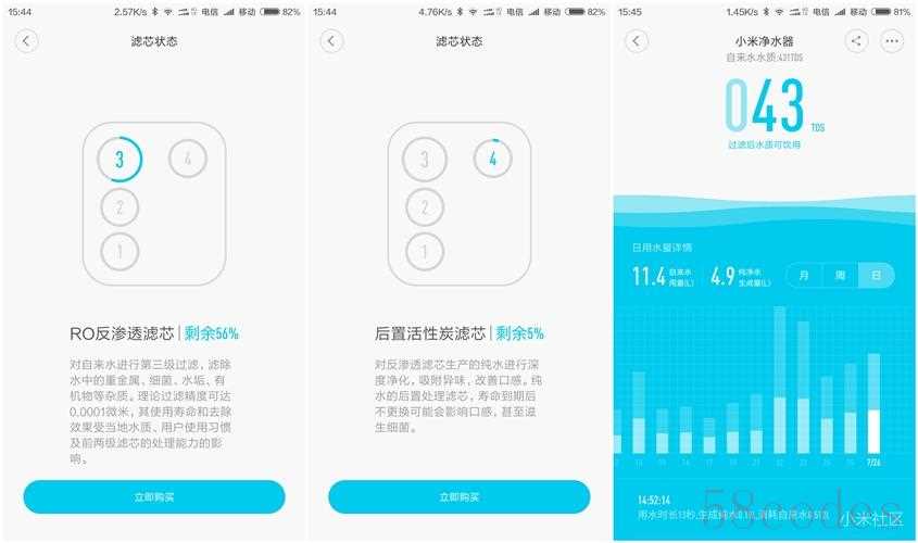滤芯包装上标注着每一级滤芯的作用规格,手机APP上也有详细的功能介绍每级滤芯的作用以及剩余寿命,并且提供了立即购买的链接,方便购买。
