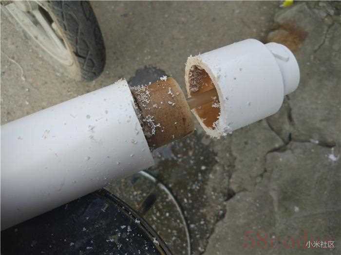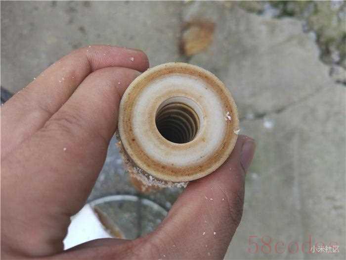 拆开第一个PP棉滤芯后,可以明显看到我这个滤芯更换的晚了,有十分严重的变色情况了,也就是说污渍非常严重。不管是PP棉还是滤芯管道内侧都已经大面积变色留有严重的残渣过滤物。。。