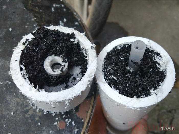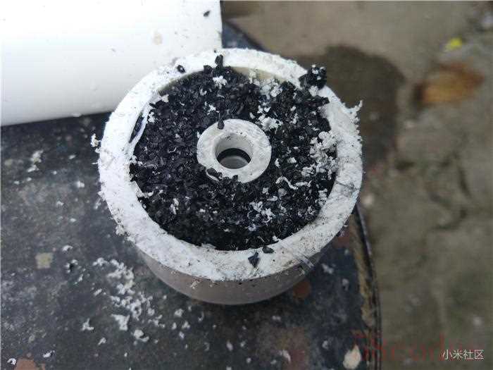 最后拆开前置活性炭和后置活性炭,这里我却分辨不出来问题在哪里了,因为活性炭本身就是黑色的,碎碎的,我实在是找不到哪里有问题,前置和后置的从内部外观上我也没分辨出来区别在哪里,不过还是要经常更换为好。。。