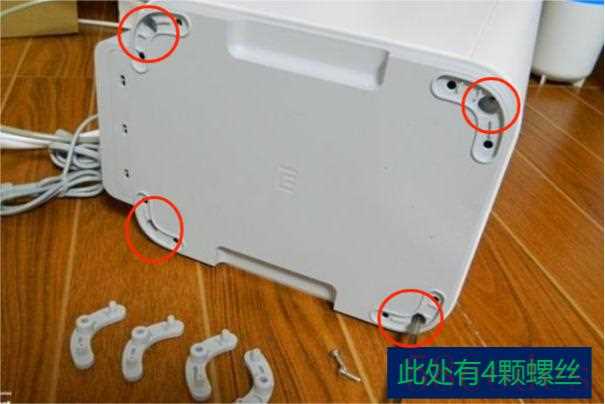 第二步,拆解外壳。将净水器下盖板拆开,防滑垫下有4颗螺丝,背部标签贴纸下有2颗螺丝,拆下这6颗螺丝就能掀开下盖板。