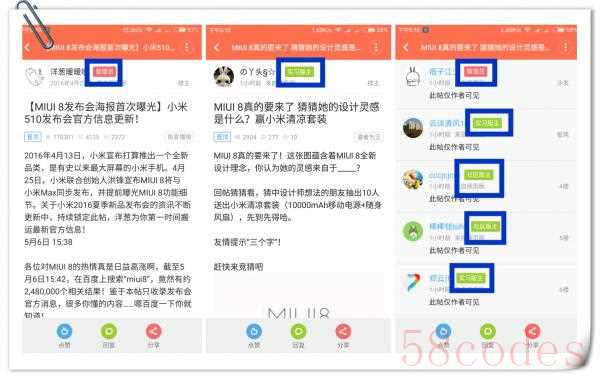 当你浏览帖子的时候,你会发现,凡是论坛的特殊组的头衔都会表现得比较特殊(内测粉丝组除外),管理员以及官方团队等用户组的颜色表现为红色,社区版主、实习版主、热心解答组等用户组的颜色表现为绿色,这让米粉们更容易区分开用户组,从中也可以看出工程师的细心。