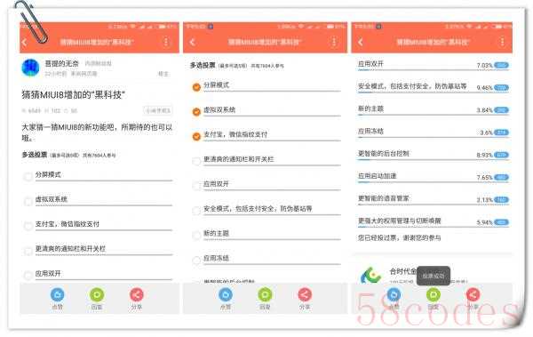 支持论坛帖子投票了,支持论坛帖子投票了,支持论坛帖子投票了,重要的事情说三遍!每个投票帖子最多可以选五项,这个功能应该是很多米粉需要的,以前,偶尔看到投票贴却不能投票的你是否感到厌烦?需要重新打开网页版才可以投票,现在终于不用了,而且MIUI论坛APP的投票功能也不属于网页版,甚至可以说比网页版的看起来更加美观,更加方便,你喜欢吗?