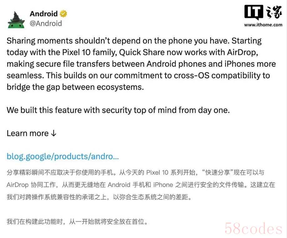 这是两大主流移动操作系统间,首次实现原生文件互传,Pixel 10 系列等原生安卓手机可以和 iPhone、iPad、Mac 互通。