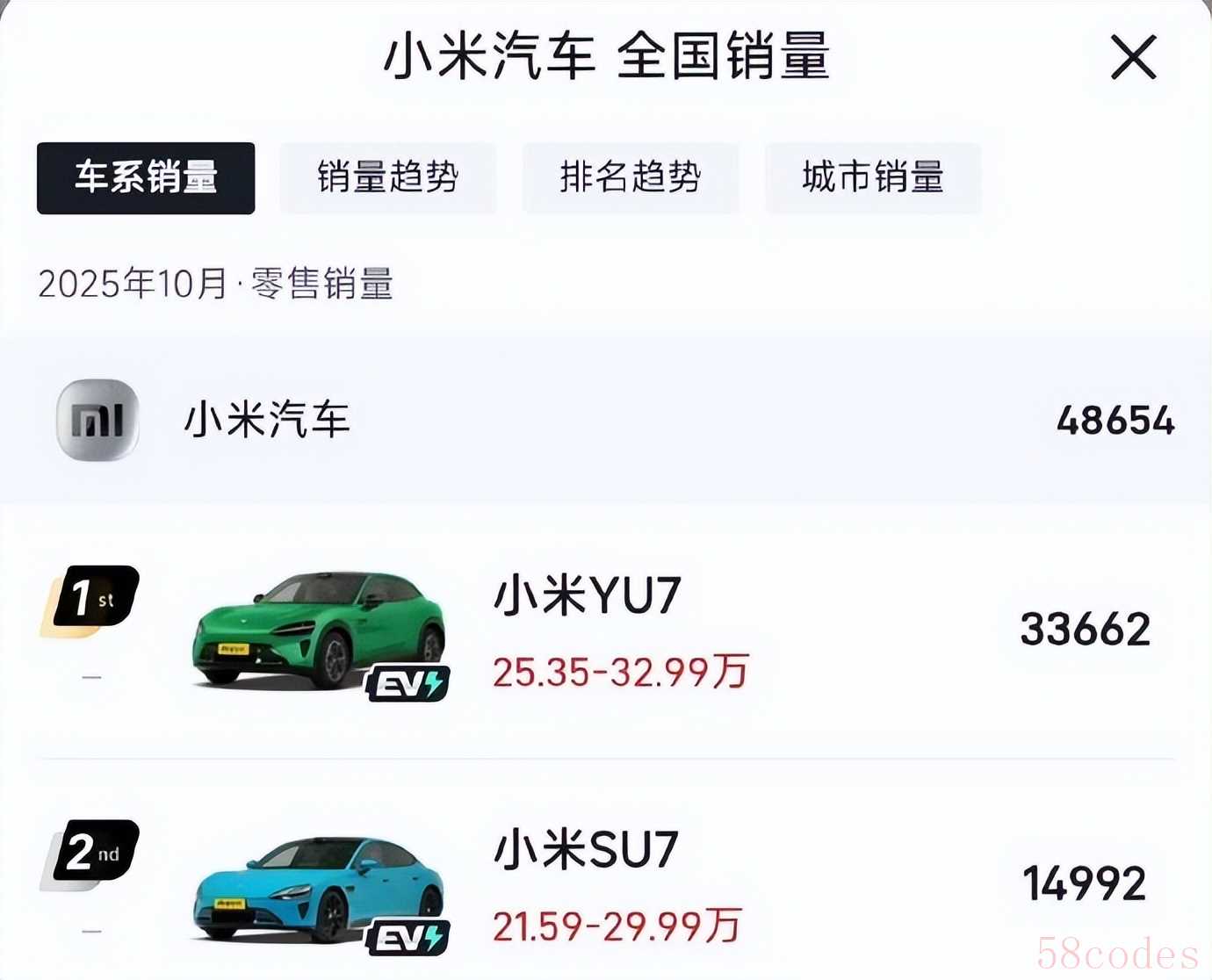 这个理解,每个月初都有上个月的战绩;小米汽车这边,乘联会数据,10 月零售销量 48654 辆,YU7 单月 33662 辆已超特斯拉 Model Y 。