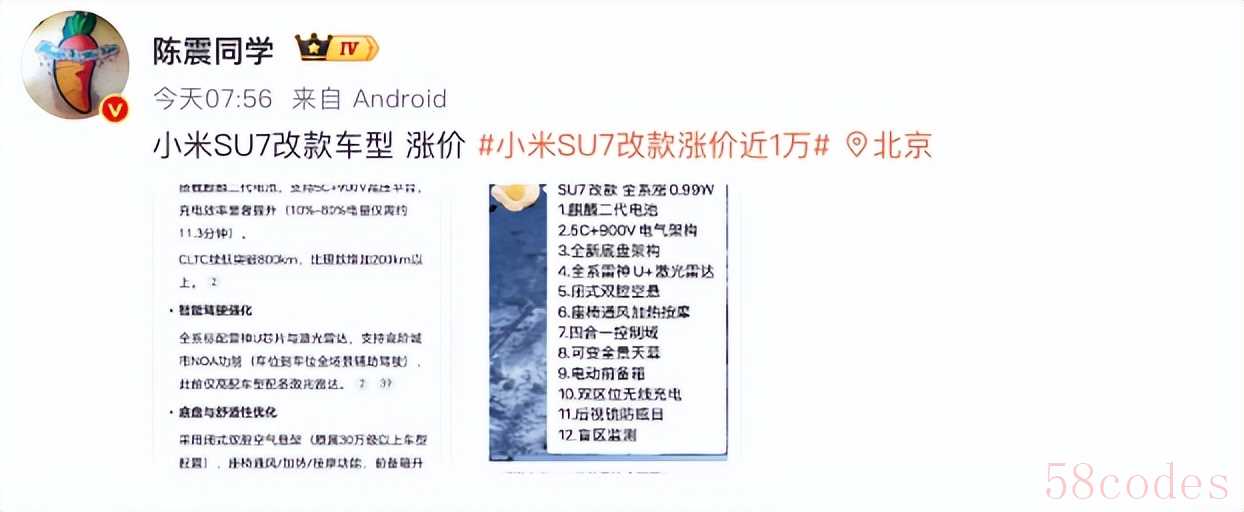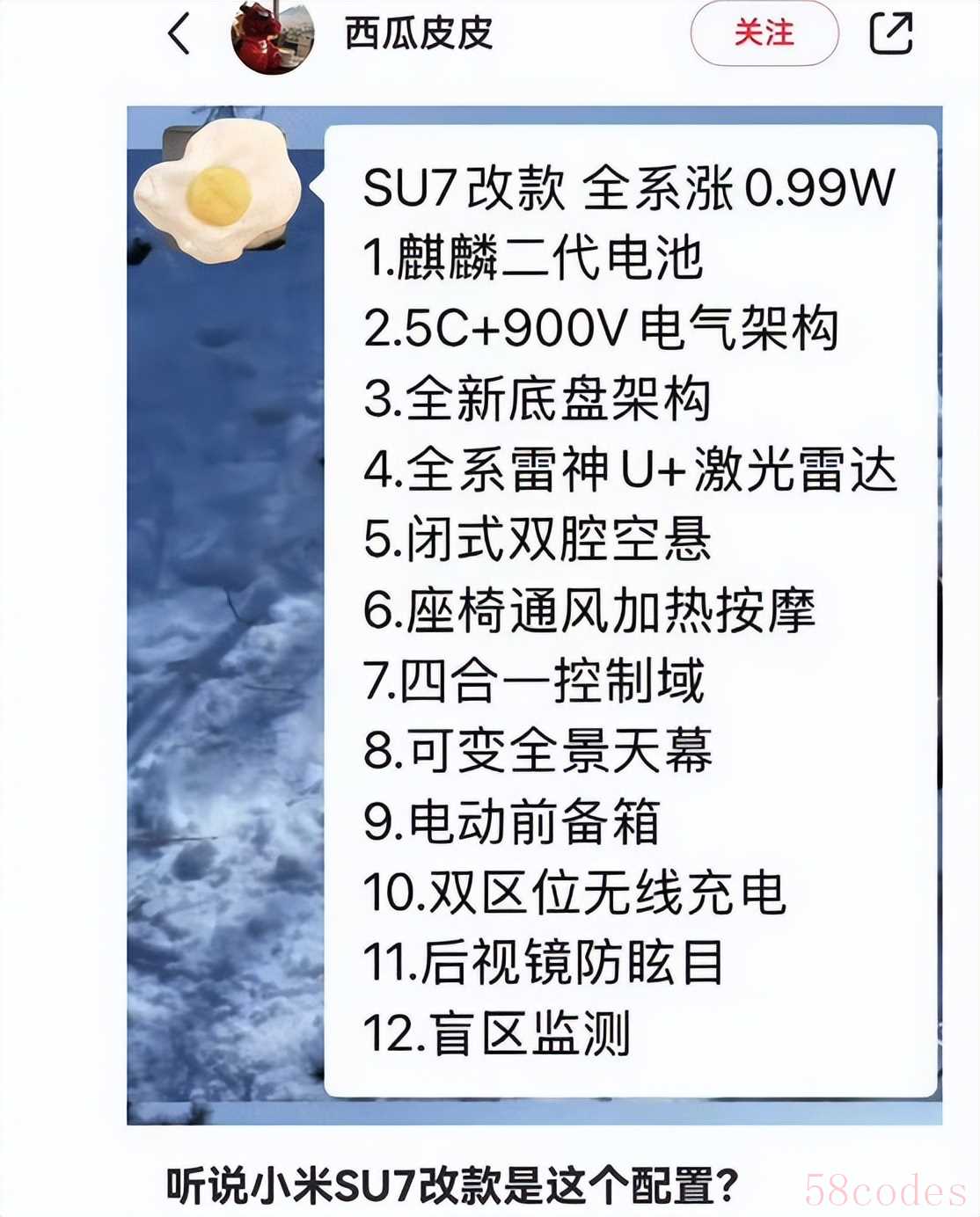 还有一则更值得关注的消息。有网友发帖称,小米 SU7 即将改款,并涨价 0.99 万元,升级 12 项配置。具体升级哪些配置呢,网友列出来了: