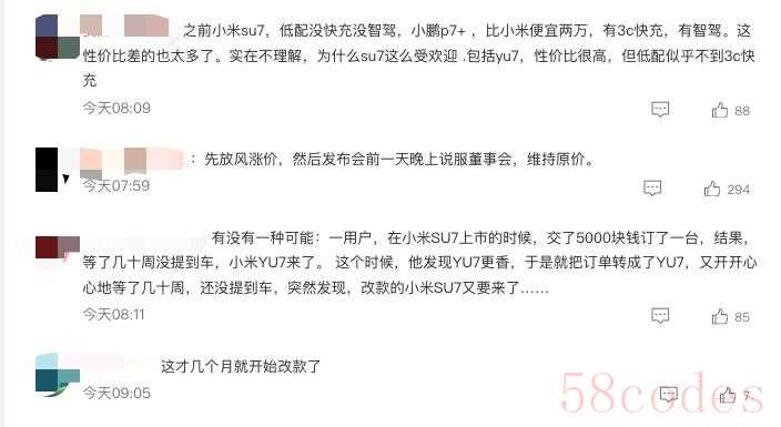 对此,网友也大胆发言:“ 先放风涨价,然后发布会前一天晚上说服董事会,维持原价。 ”“ 又亏钱卖车啊!这么多升级,就涨价一万? ”“ 有没有一种可能:一用户,在小米 SU7 上市的时候,交了 5000 块钱订了一台,结果,等了几十周没提到车,小米 YU7 来了。 这个时候,他发现 YU7 更香,于是就把订单转成了 YU7 ,又开开心心地等了几十周,还没提到车,突然发现,改款的小米 SU7 又要来了…… ”