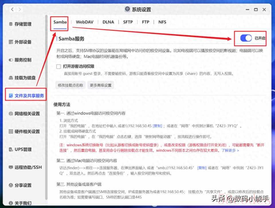首先肯定是的开启咱们极空间NAS上的smb服务了,位置在“系统设置--文件及共享服务--Samba开启”。