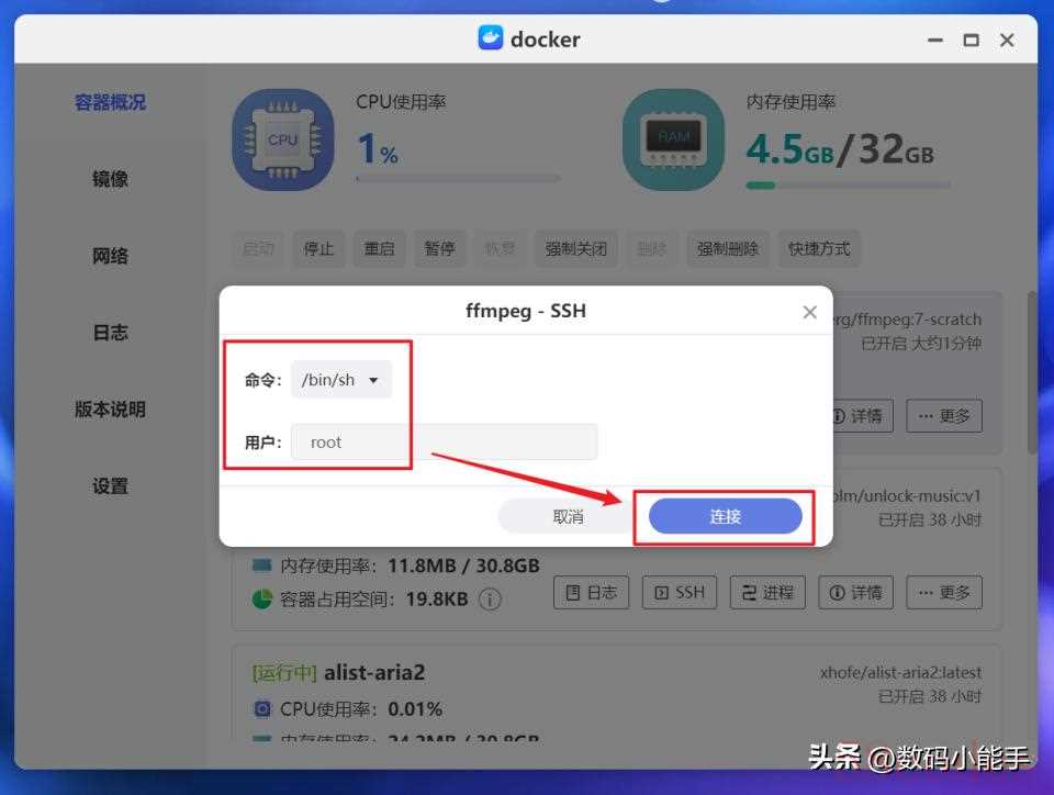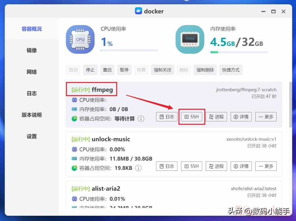 在极空间的Docker管理器中可以看到 FFmpeg 容器运行中,咱们点击容器内的“SSH”。