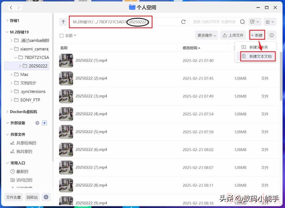 接着我们来到极空间这边,找到我们已经修改好标题名称的“20250222”子文件夹,在该子文件夹下“新建文本文档”。