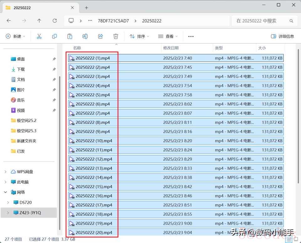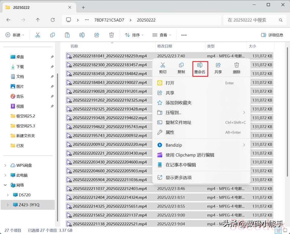 然后将所有2025年2月22日的视频都拖到这个子文件夹,Ctrl+A快捷键全选之后,鼠标右键选择“重命名”,我们仅需要设置一个基础命名(便于识别我这里也给出“20250222”的名称),然后回车。