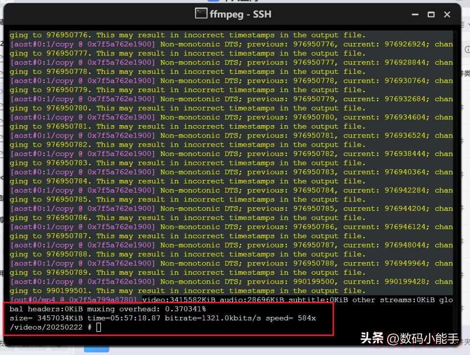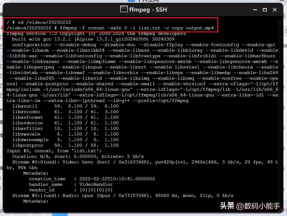 在这个终端界面,先输入命令:【cd /videos/20250222】(后面的“20250222”就是我们需要合并视频的子文件夹),回车之后,接着输入命令【ffmpeg -f concat -safe 0 -i list.txt -c copy output.mp4】,然后FFmpeg 就开始自动合并视频了。