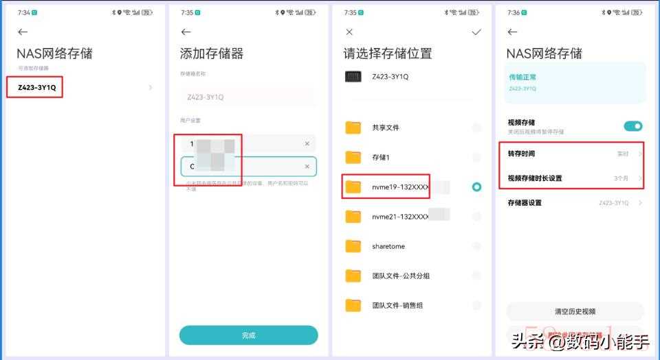然后在下一个界面,小米摄像头会自动找到局域网内的极空间,选择之后输入登录极空间的账号和密码,最后选择需要将摄像头录像文件储存的硬盘位置就可以了。