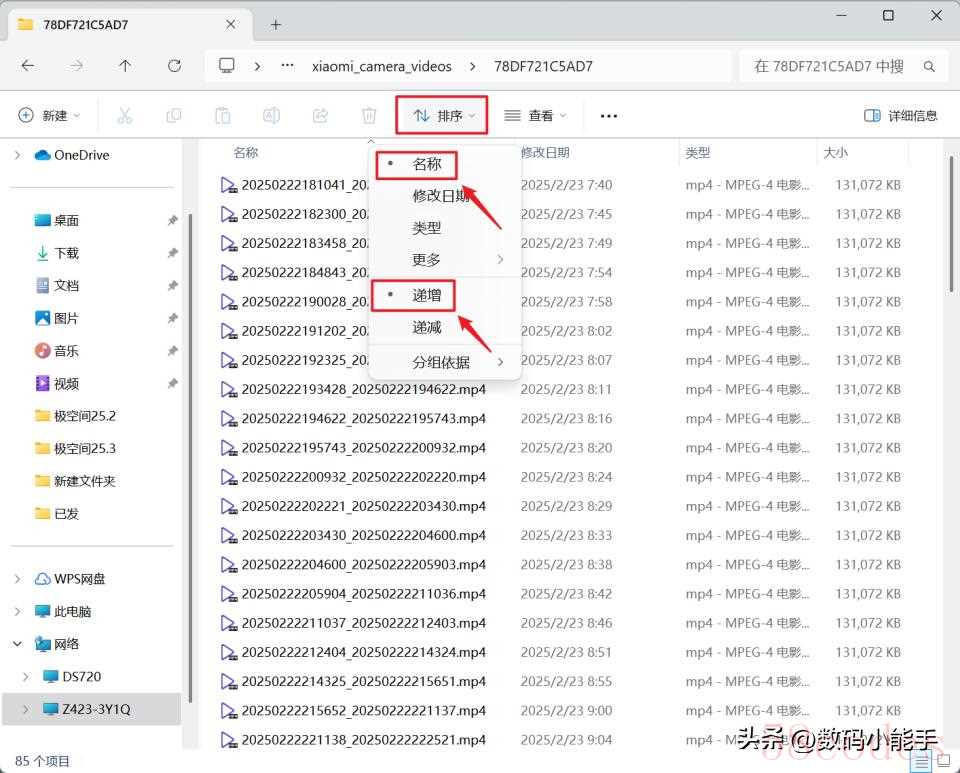 首先我们将录像视频的文件smb共享到电脑端,为了便于之后的操作,我们将这些文件的排序方式设置为“以名称的方式递增”,这样这些视频就会从最早开始的录像往后站好队了。