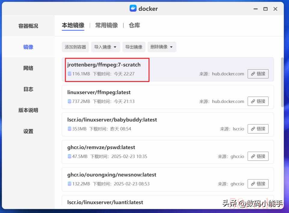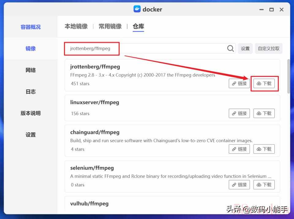 打开极空间的Docker镜像仓库,搜索并下载镜像“ jrottenberg/ffmpeg”。