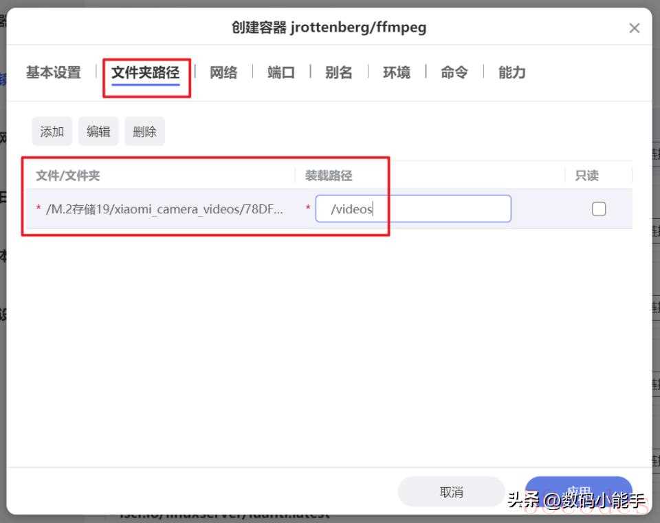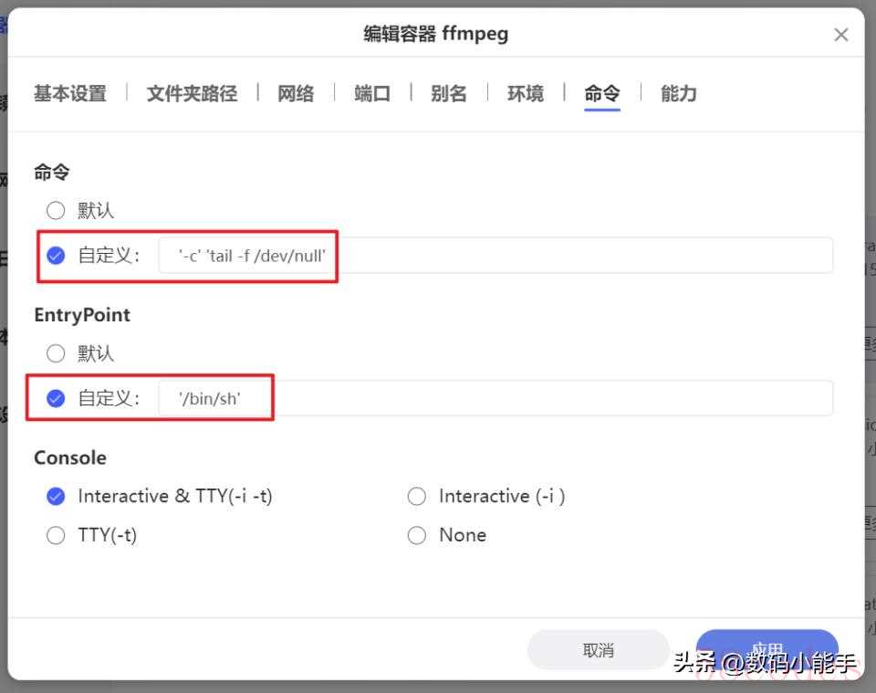 其它就没什么可修改的了,点“应用”即可完成 FFmpeg 容器的部署。