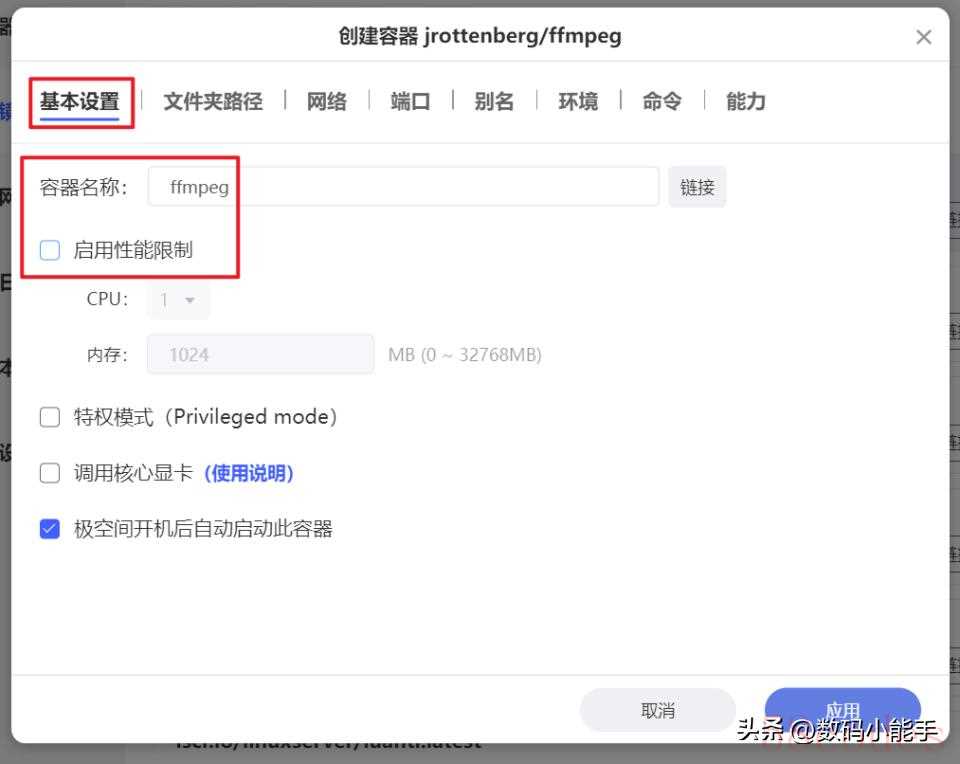 【基本设置】这里,容器名称自己可以随意修改,取消勾选“启用性能限制”。