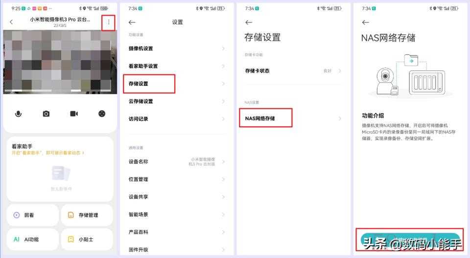 接着将小米摄像头接入极空间NAS就简单了,一般直接按照向导就就可以了。比如说我使用的这款小米智能摄像机3 Pro,依次“点击主界面右上角三个点--存储设置--NAS网络存储--连接NAS存储”。