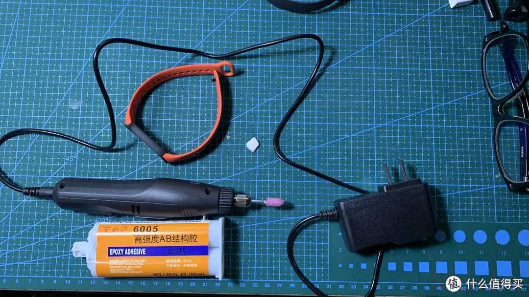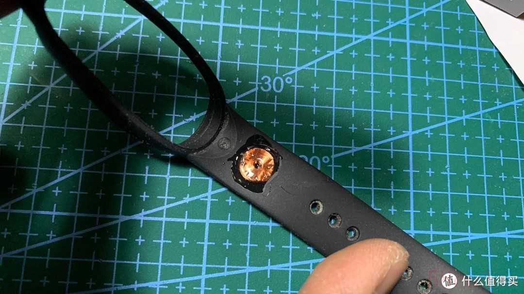 这个是练手弄得如果没有经验的,最好先找一条杂牌表带练练手感,首先将线圈放在合适的位置上,用水笔大概划出圆形,然后就是电磨机开磨,注意角度和边缘,另外不能太狠了,太狠弄穿了就不太好了。至于说合适的位置,最好先把手环待在手上,看哪里不太容易弯折又比较适合放线圈,确定大概位置就好,毕竟每天弯折时间长了也就不结实了。