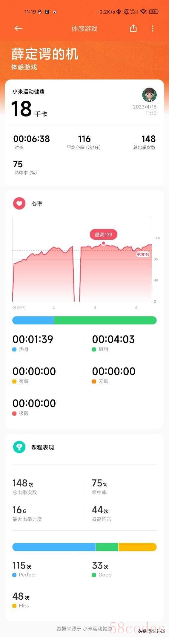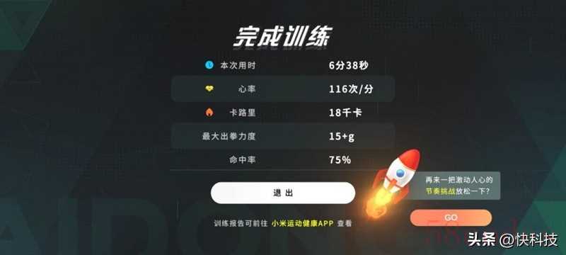 在训练完毕后,随之会看到训练过程的用时、平均心率、所消耗的卡路里、最大出拳力度以及命中率,当你达到了一定的标准以后,就可以进行后面的进阶课程训练,在游戏中加强锻炼,这也是一种非常新颖的锻炼方式。