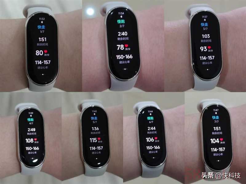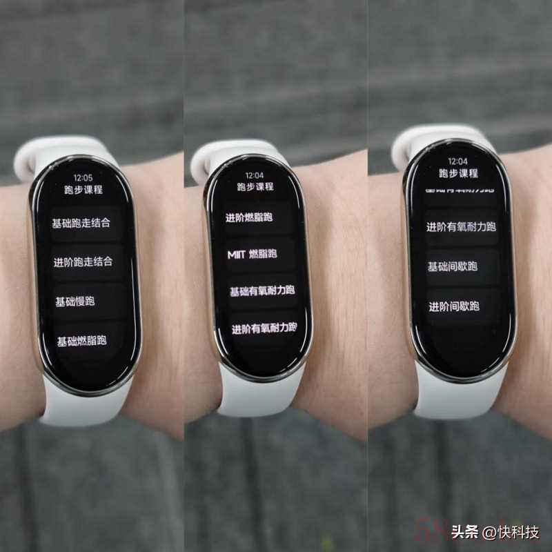 小米手环8还支持了7 Pro中首发的腕上跑步课程,包括跑走结合、燃脂跑、耐力跑、间歇跑等功10中课程,并有专门的AI教练智能陪跑,我们可以在手环上体验到科学直观的跑步指导。