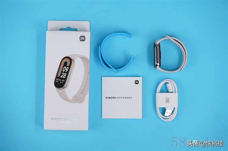 小米手环8包装内部附带的磁吸式充电器、说明书以及一枚表带。