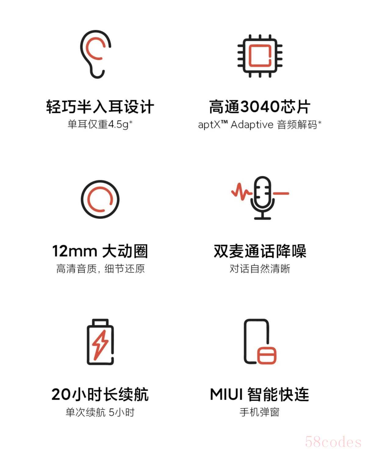 内置高通QCC 3040 芯片,让这款耳机支持了 aptX Adaptive 解码,传输更高效,耳机拥有 12mm 大动圈设计,让音质更清晰,音乐细节更丰富,经过了小米音频实验室调教,低音雄厚高音清晰不失真。
