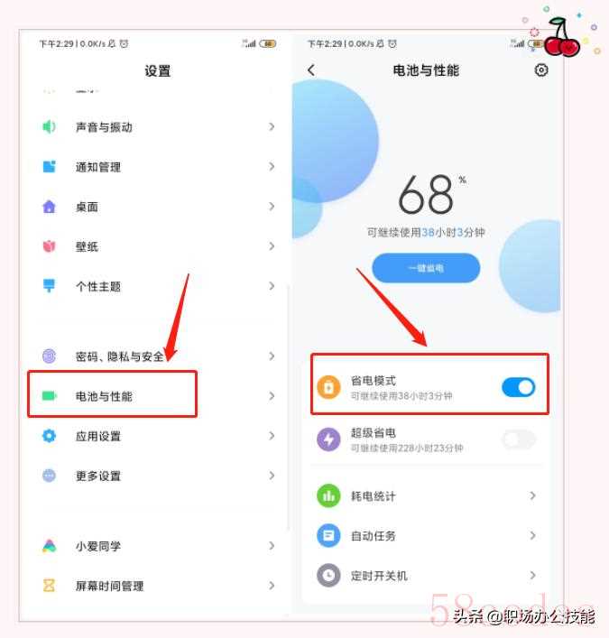 省电模式:手机设置—点击电池和性能—打开省电模式