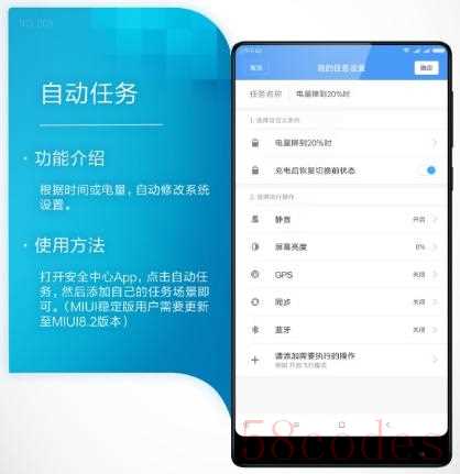首先,打开“安全中心”,然后点击“自动任务”,最后米粉们再根据个人喜好添加自己的任务场景即可,比如设置在电量降至20%的时候,开启“静音”、打开“蓝牙”等等。