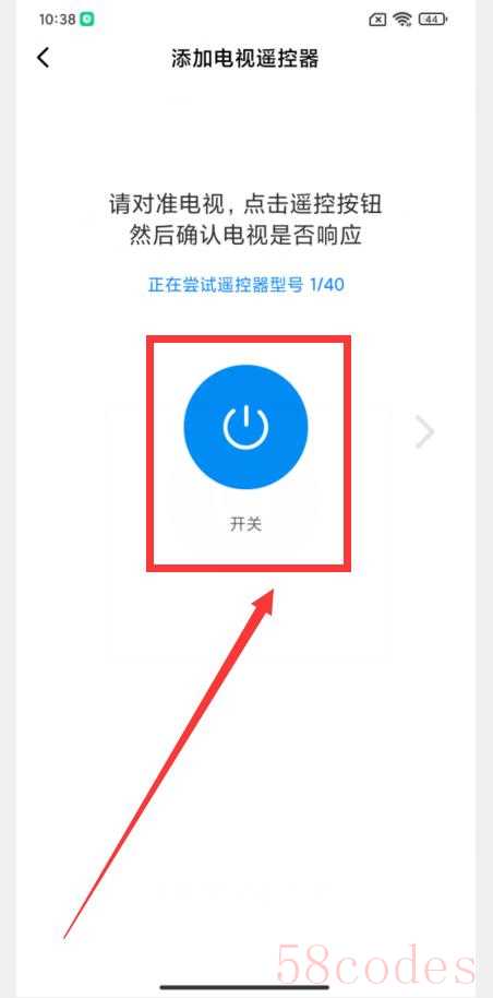 如果你家的电视机是“开机”状态,就点击上图的“已开机”按钮,否则点击“已关机”,进入下一个界面(如下图),这时,在“开关”按钮的上方有一句提示玉器:“正在尝试遥控器型号 1/40”,这表示海信电视机的遥控器有40多种,这里一个一个地来需要匹配。