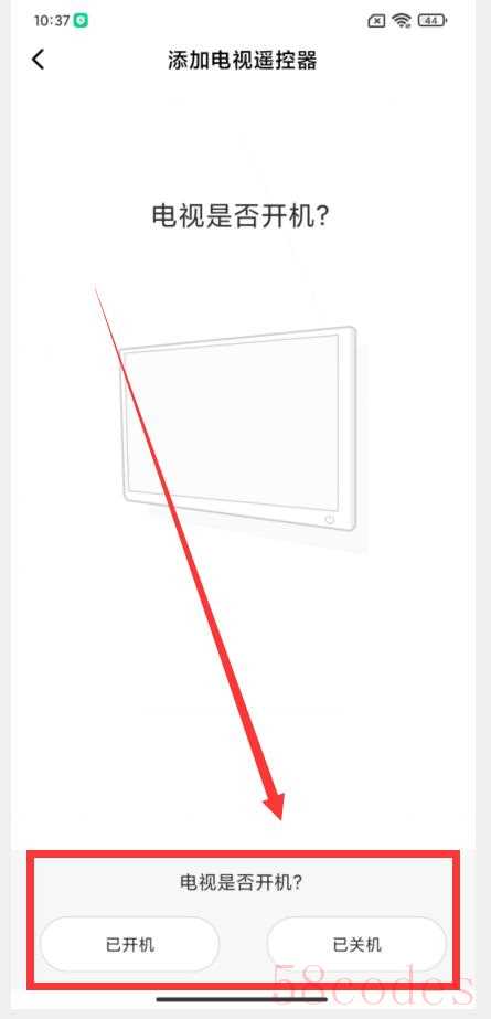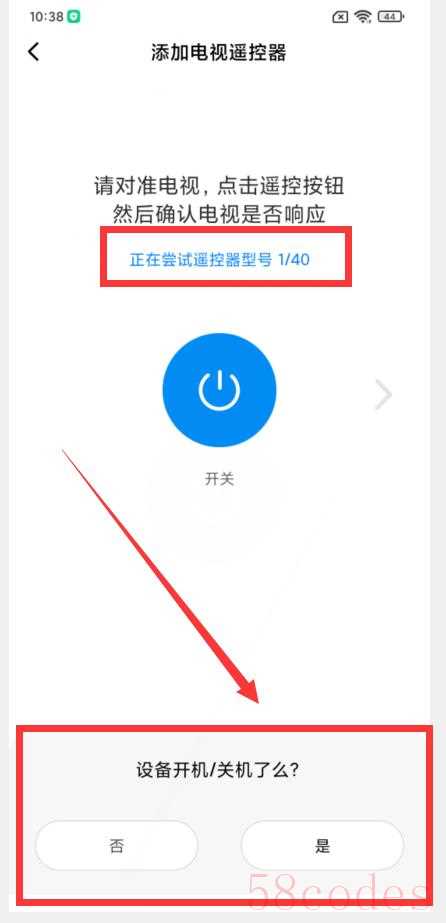 把手机顶部对准电视机(一定要对准哦),然后点击上图的“开关”按钮,这时在屏幕底部会显示“是”与“否”。