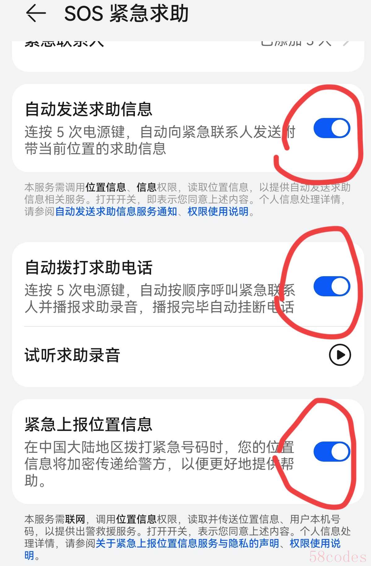 · 华为手机:在设置中搜索“SOS紧急求助”,开启“自动发送求助信息”和“自动拨打求助电话”开关。之后在紧急情况下连续按5次电源键,手机就会自动向紧急联系人发送附带当前位置的求助信息,并自动按顺序拨打求助电话。