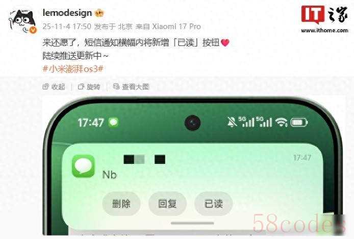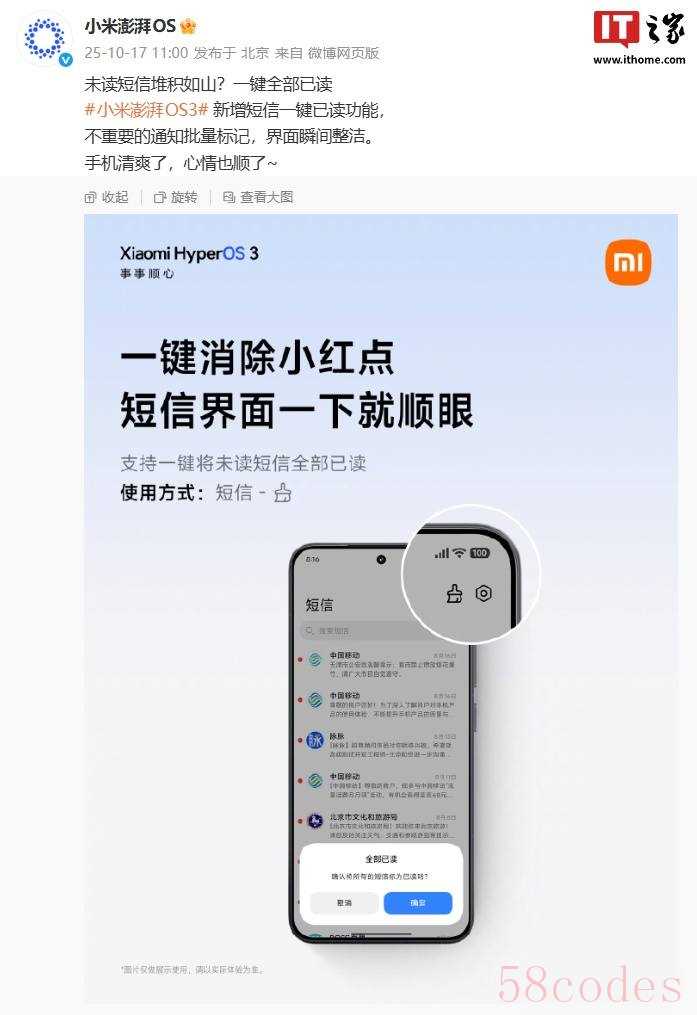 前几天我刷微博时,看到小米工程师发布消息说,“短信已读”功能已经重新加回来了,这个不是测试版才有的内容,而是直接放进正式使用的系统里,从十月底开始,新款MIX Flip 2手机就能用上这个功能,旧机型也会逐步更新推送,之前这个功能被拿掉过,现在又把它恢复回来,这件事确实让人觉得挺有意思。
