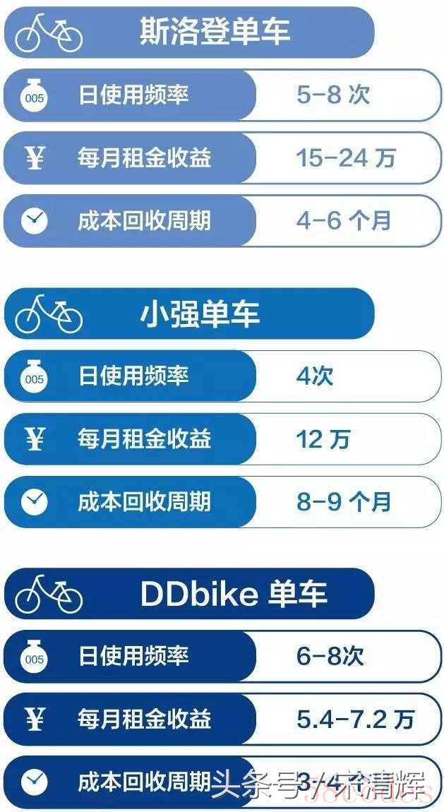 另一个来自成都的DDbike则称,以15万人口的县城为例,投放300辆车,资金约13.8万,客户端软件的使用费用3万,成本总计18万元,每辆车的日均使用频率为6-8次,以此计算3至4个月就可收回投资本金。