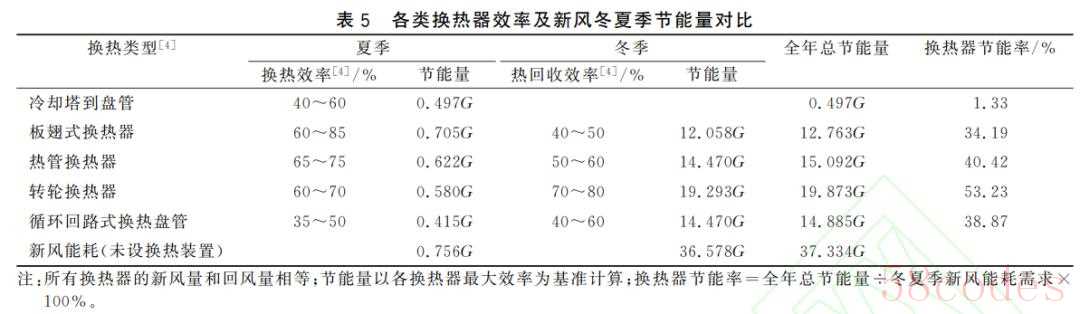 冬季先将新风预热至5℃,再与回风通过热回收装置(二次回风通道走回风)换热,新风得以再 热。依据不同类型空气热回收装置冬夏季等湿加热、降温效率,计算得到各种热回收装置的节能量, 如表5所示。