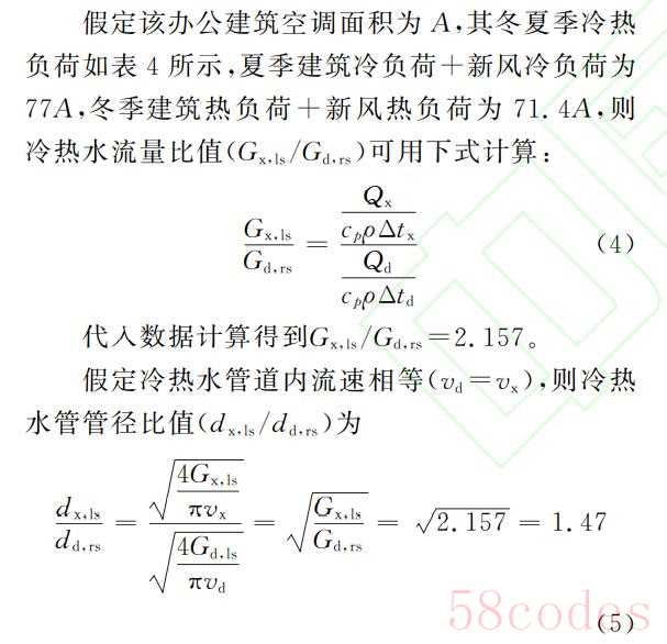 综上所述,由于冷热水供回水温差不同,使得设计计算的冷热水管管径不同,冷水管管径约为热水管管径的1.47倍。对于严寒、寒冷地区全年运行的蒸发冷却空调系统,考虑到经济性及冬夏季空调运行时长,其冬夏共用的空调水管管径可优先按冬季情况设置,夏季空调水系统流速可略高于冬季。