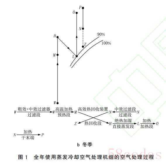 下面重点研究新风+干工况末端的空调系统中全年用供冷供热蒸发式新风机组的空气处理过程。