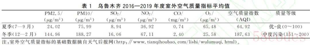 因此,本文通过对新疆乌鲁木齐市连续3年冬夏季室外空气质量指标进行统计发现,冬季室外空气质量多为中度污染,各类污染物指标平均值为夏季指标的 2~6倍,如表1所示。