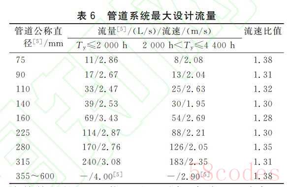 ANSI/ASHRAE/IESStandard90.1- 2016中限定了空调系统不同运行时长下空调水系统的最大设计流量,如表6所示。全年运行时长 Ty≤2000h的变流量水系统设计流速较大,约为全年运行时长在2000~4400h范围内的变流量水系统设计流速的1.28~1.38倍。
