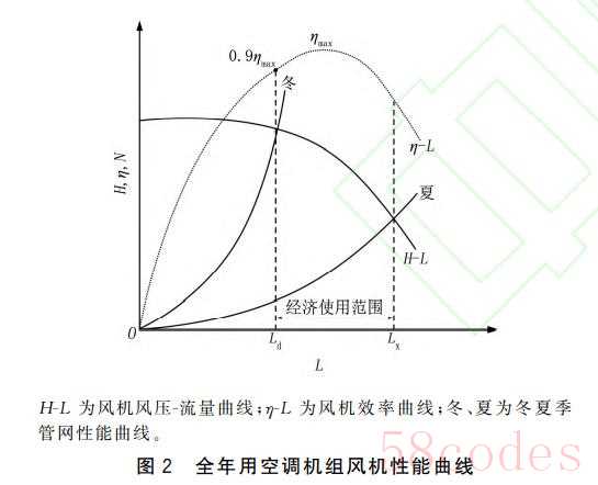图2为某离心式风机性能曲线图,该风机采用 后向式叶片,转速为 2900r/min,风机最高效率 (ηmax)下的风量、风压和轴功率为风机运行最佳工况参数。空调系统冬季提供新风仅为人员所需最小新风量Ld,冬季风机在0.9ηma下运行,若冬夏季采用同一风机,则夏季风机的送风量Lx不能太大, 最好在所选风机的经济使用范围内。若冬夏季送风量相差太大,则必然存在某一季节空调机组风机低效运行,不节能。