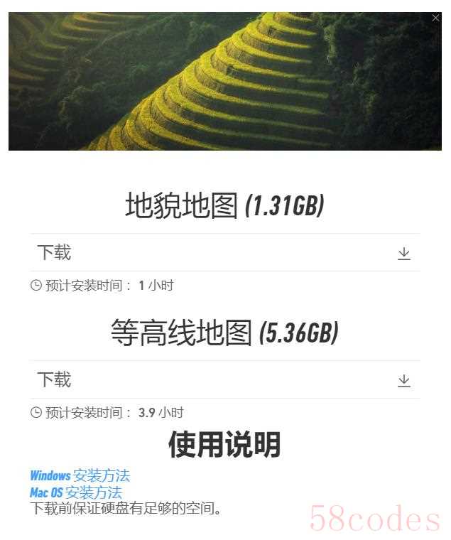 点击“亚洲局部-3”,出现下载界面,分别下载,地貌地图1.31G,等高线地图5.36G,下载时保证磁盘空间足够。