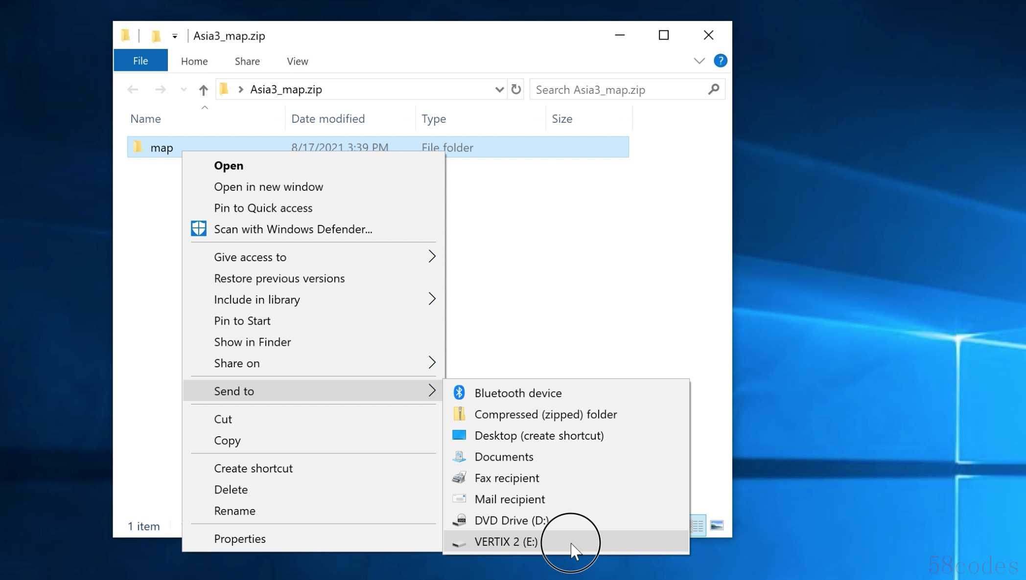 c) 打开解压后的目录,在目录上按鼠标右键,点击“发送”菜单,选择 “VERTIX 2”,并等待复制完成。