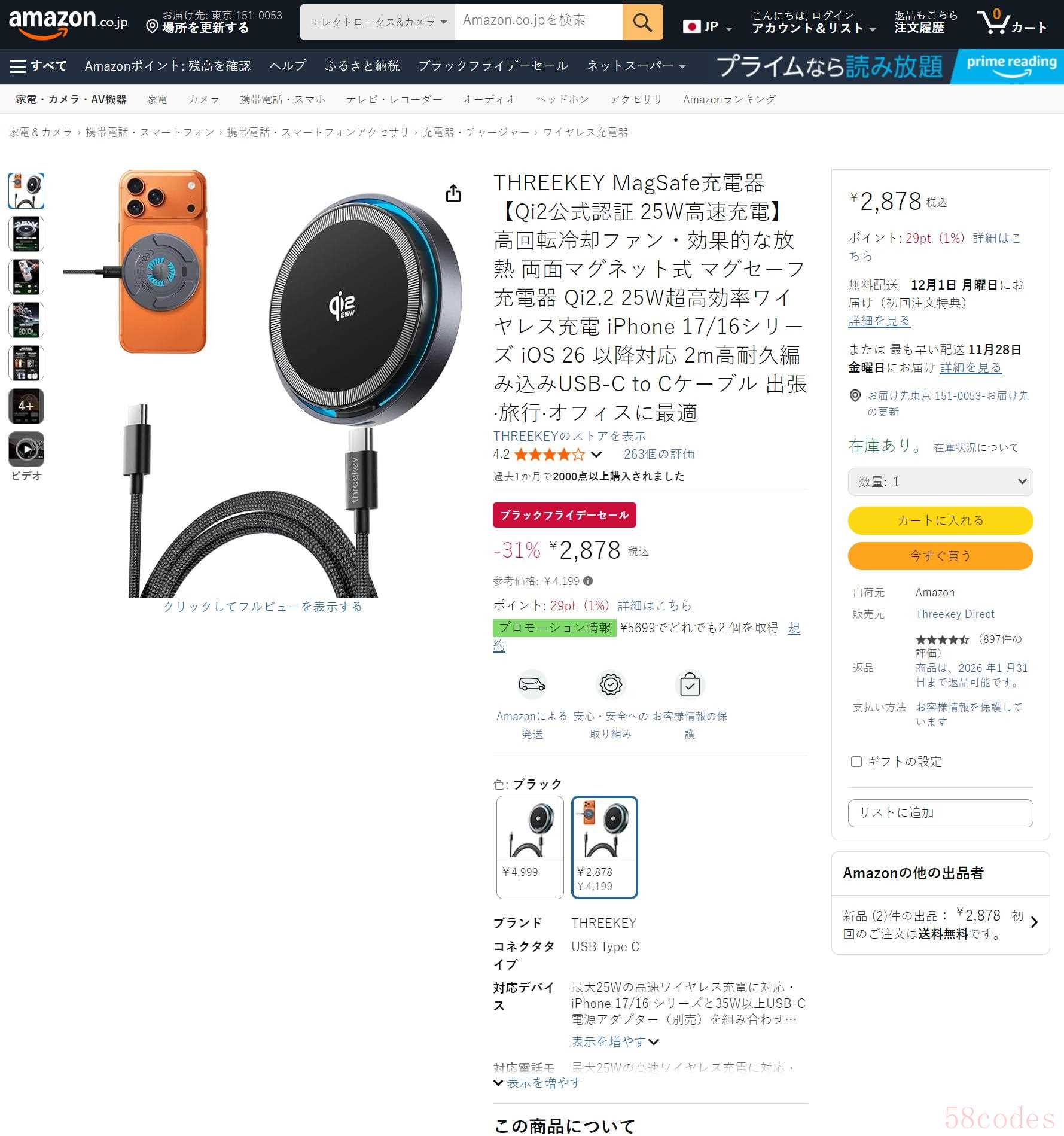 榜单第八是THREEKEY的无线充,内置主动散热风扇,通过WPC无线充电联盟Qi2.2认证,,满足iPhone 16、17系列25W磁吸无线充电,可向下兼容其他iPhone型号。亚马逊用户评分4.2,评论数263条,月销量2000个,售价2878日元。