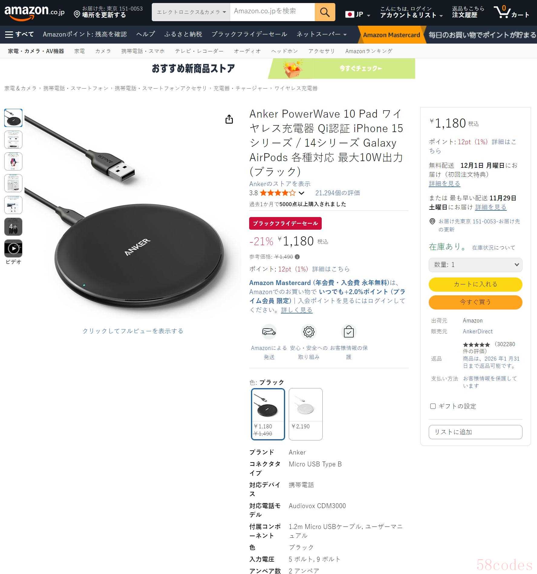 榜单第三是安克推出无线充电板,通过Qi认证,最高支持10W无线充电功率,适用于iPhone、三星等品牌手机、AirPods等设备充电,拥有黑白两种配色可选。亚马逊用户评分3.8,评论数高达21294条,月销量5000个,售价1180日元。
